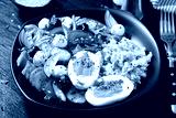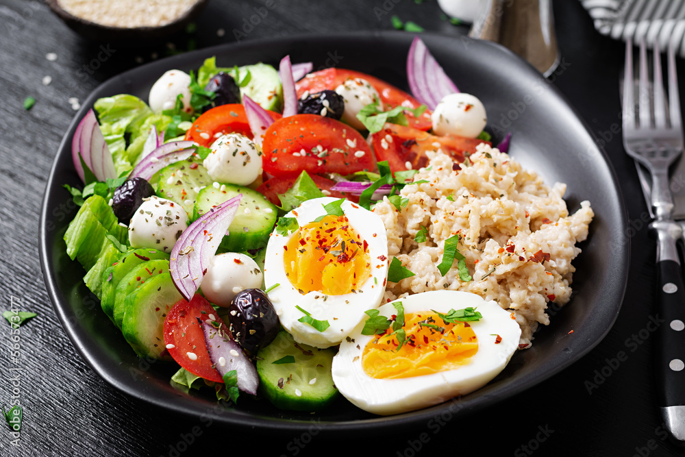 Healthy breakfast. Greek inspired savory oatmeal with fresh cucumber, tomatoes, olives, lettuce, mozzarella cheese and boiled egg. Top view