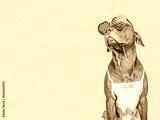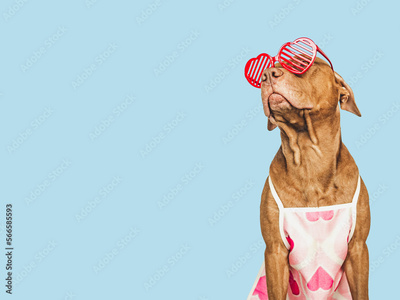 Lovable, pretty brown puppy and red sunglasses. Greeting card layout with space for your inscription. Closeup, indoors, studio photo. Congratulations for family, relatives, friends and colleagues