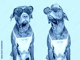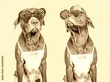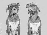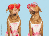 Lovable, pretty brown puppy and red sunglasses. Greeting card layout with space for your inscription. Closeup, indoors, studio photo. Congratulations for family, relatives, friends and colleagues