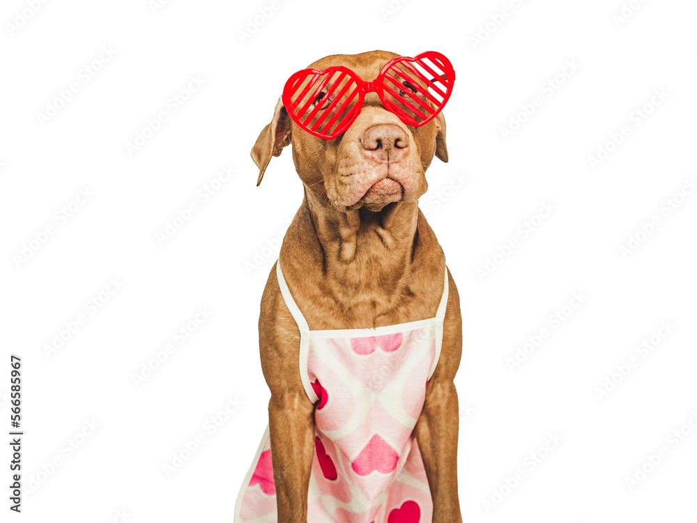 Lovable, pretty brown puppy and red sunglasses. Greeting card layout with space for your inscription. Closeup, indoors, studio photo. Congratulations for family, relatives, friends and colleagues