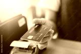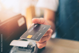 Customer holding credit card for payment on card reader machine to owner at restaurant.