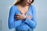 Girl holding hand chest pain. Woman suffering from chest pain. Woman having heart attack. Heart attack concept. Girl feeling heart pain and holding her chest. Healthcare and medical concept