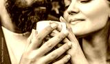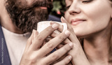 Female and man hands holding cup of coffee. Lovely couple holding cup of coffe in hands. Bearded man hugs girl
