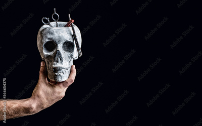 Barber scissors and straight razor, barber shop. Still life skull with shaving tools. Barbershop tool on black background. Skull barber. Vintage barber shop tools