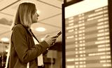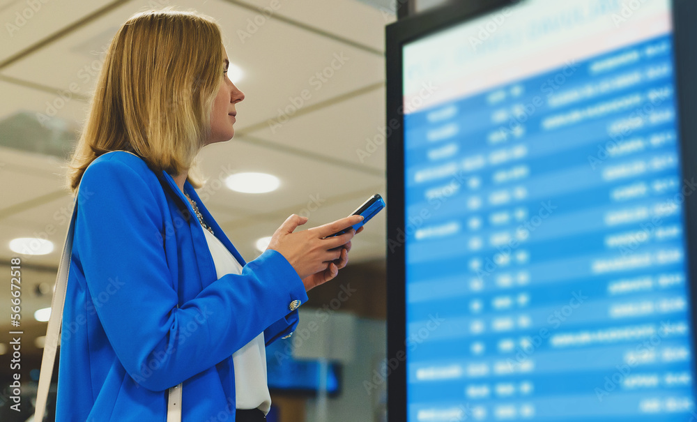 Woman in business suit in checking her flight in airport.
