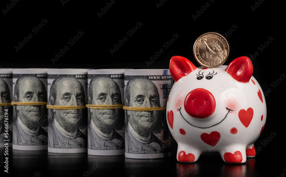 Funny piggy bank and 1 US dollar coin on the background of 100 American dollars bills on a black background