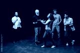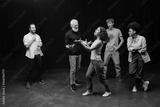 multiracial woman gesturing while rehearsing near bearded art director and smiling interracial actors.