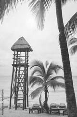 Retro toned picture of an empty tropical beach with lifeguard tower, travel concept.