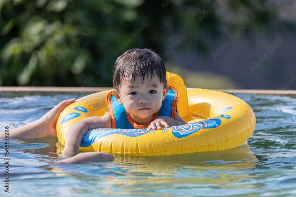 Portrait image of 1-2 years old childhood child happy and enjoying playing water on pool