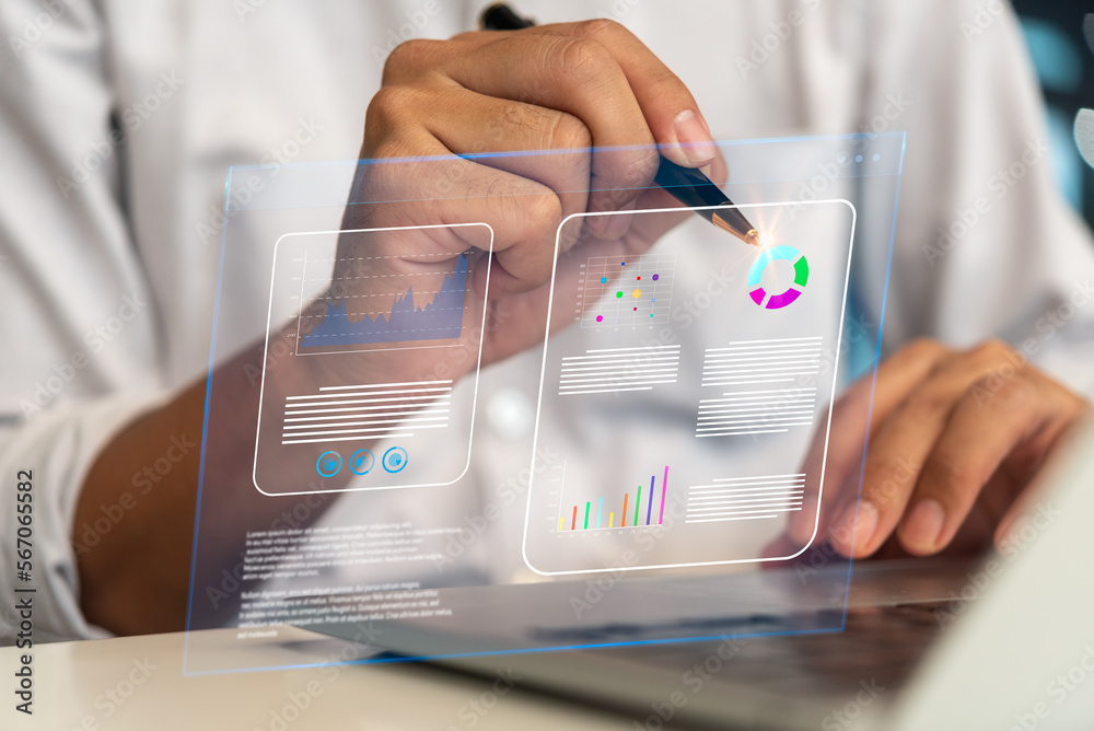 Business graph digital marketing analysis dashboard and charts big data management use laptop working, Business strategy concept, performance insight reports on virtual screen.
