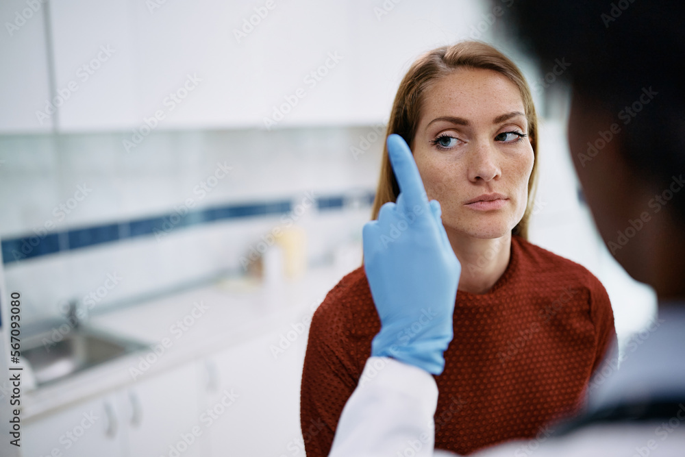 Mid adult woman following doctor’s finger during eye neurological exam at medical clinic.