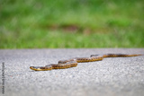 Close-up of blotched snake or Elaphe sauromates on asphalt road