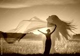 woman in the field feeling free at peace in nature holding fabric cloth blowing in the wind.