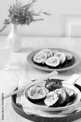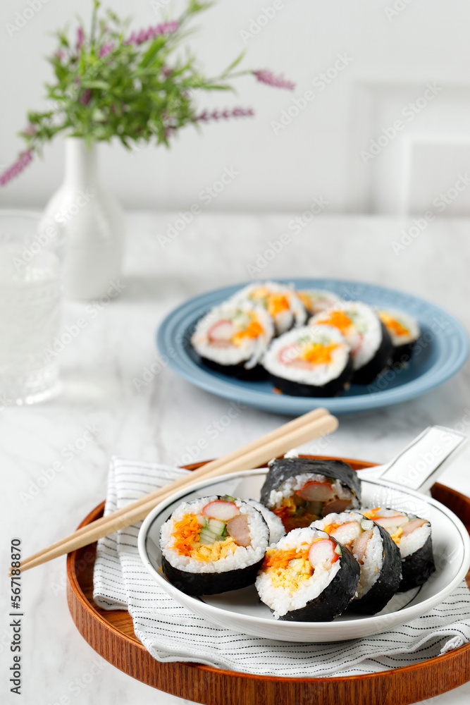 Gimbap or Kimbap Korean Roll Rice with Eggs, Carrot, Sausage, and Nori