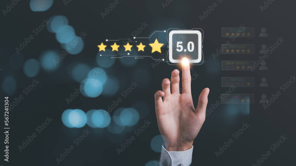 customer service and satisfaction concept,service satisfaction,very impressive rating,Evaluation and Audit,Consumer and 5 star icon,Represents the highest quality in terms of products and services.