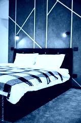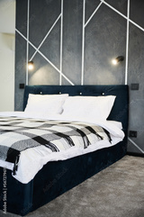 Stylish bedroom interior with big black bed and dark geometric wallpaper on background. Side view of elegant dark colored bed and hanging soft light against gray wall indoors. Concept of interior.