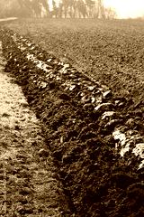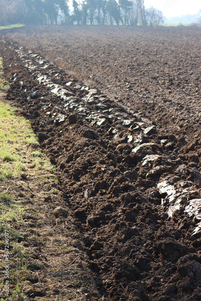 Freshly plowed field in the italian countryside on late winter. Agricultural field on a foggy day