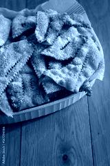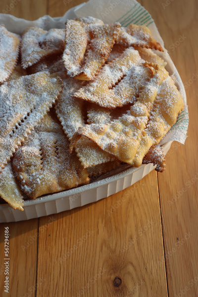 Italian Carnival pastry. Traditional carnival sweet crisp pastry deep-fried and sprinkled with powdered sugar. Chiacchere or crostoli, bugie, cenci in a white plate on wooden table