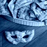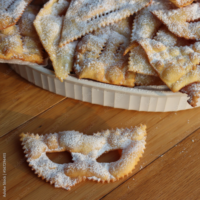Italian Carnival pastry in shape of a Mask. Traditional carnival sweet crisp pastry deep-fried and sprinkled with powdered sugar. Chiacchere or crostoli, bugie, cenci in a white plate on wooden tabl