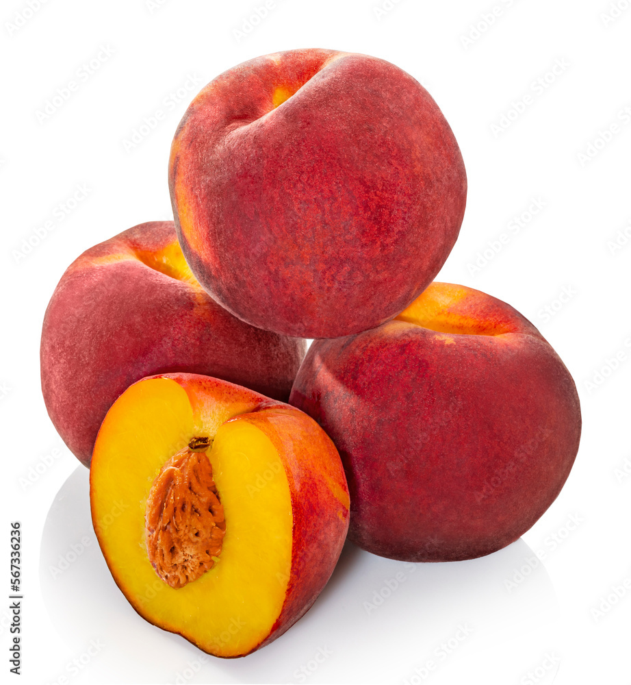 Peaches on a white isolated background. Ripe fresh tropical nectarine fruit piece with pit.