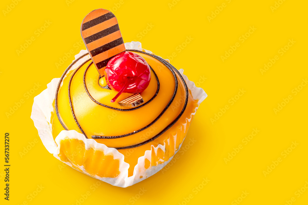 Chocolate yellow glazed cake with sugar cherries. Exquisite Fresh delicious dessert.