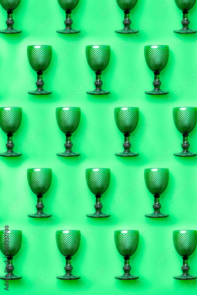 Colored glass goblet. Abstract background with empty wine glass flat lay. Concept of holiday background