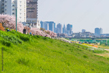 春の多摩川河川敷 遠方に見える川崎駅前のビル群【東京都・大田区-神奈川県・川崎市】