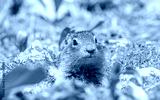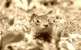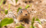 Front view of a ground squirrel between plants in Revelstoke National park, Canada