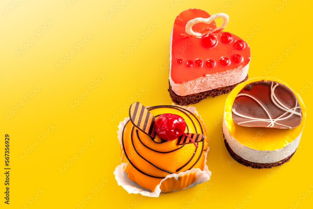 Various cakes with fruit jelly chocolate decoration. Exquisite Fresh delicious mousse dessert on colored background.