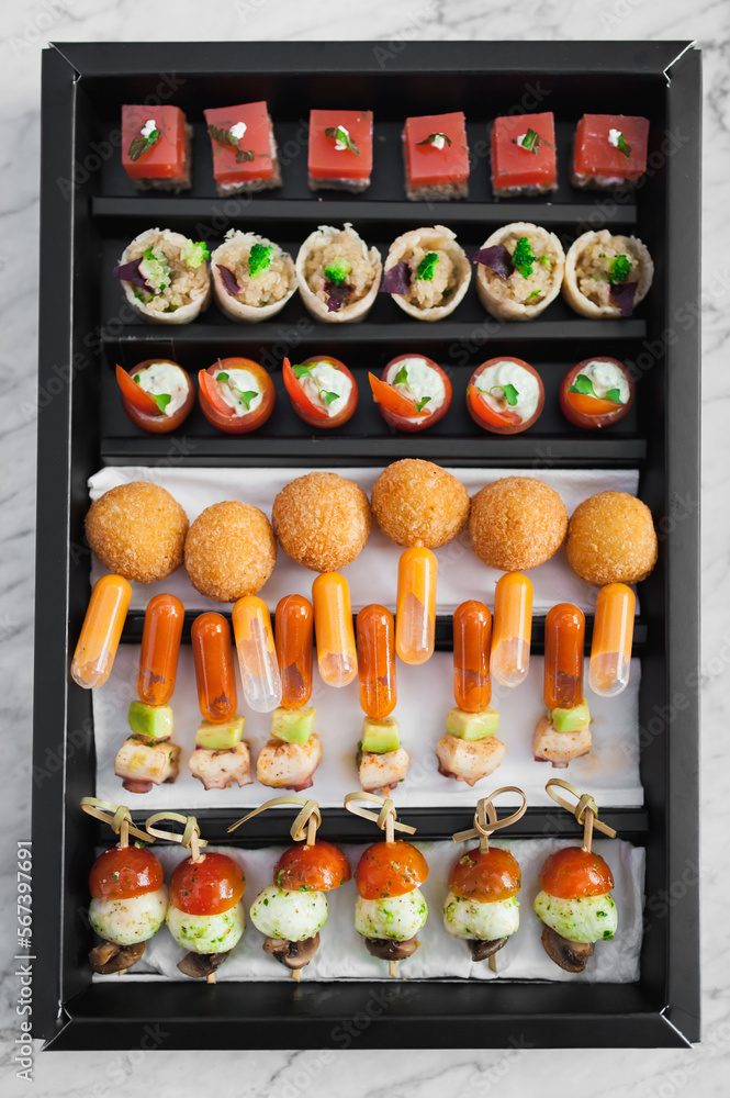 Top view of gourmet hors d'oeuvres in a rectangular box. Mixed appetizers for takeout. Rows of tasty assorted canapés. Vertical food background.
