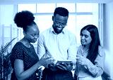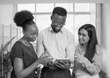 Three coworkers stand and discuss workplace issues with digital tablet, smiling