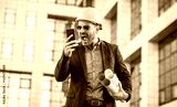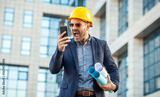 Something is wrong on building site. Angry architect yelling on head of the construction site while talking with him via mobile phone. Construction concept
