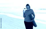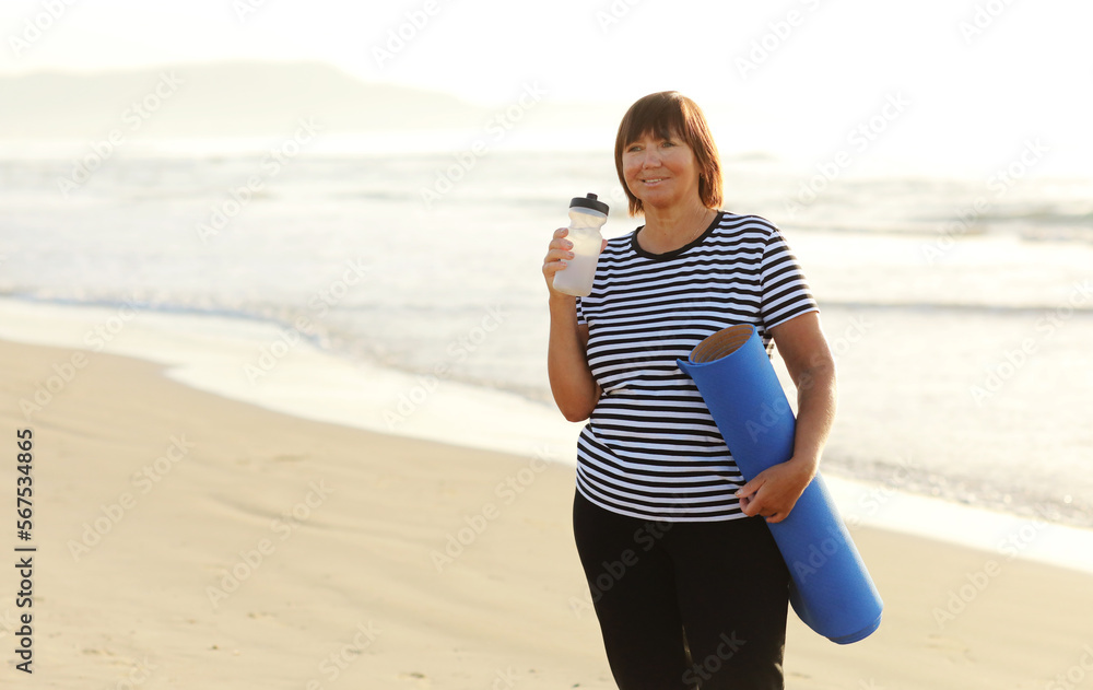 Smiling mature adult woman with bottle of water after exercising outdoors holding yoga mat outdoors on beach by sea on summer. Senior healthy lifestyle, vitality, healthcare concept. copy space