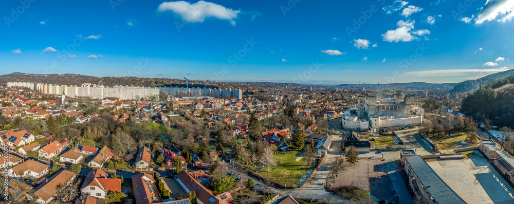 Aerial panorama of Diosgyor neighborhood in Miskolc new panel communist style block houses single family homes and the Gothic castle