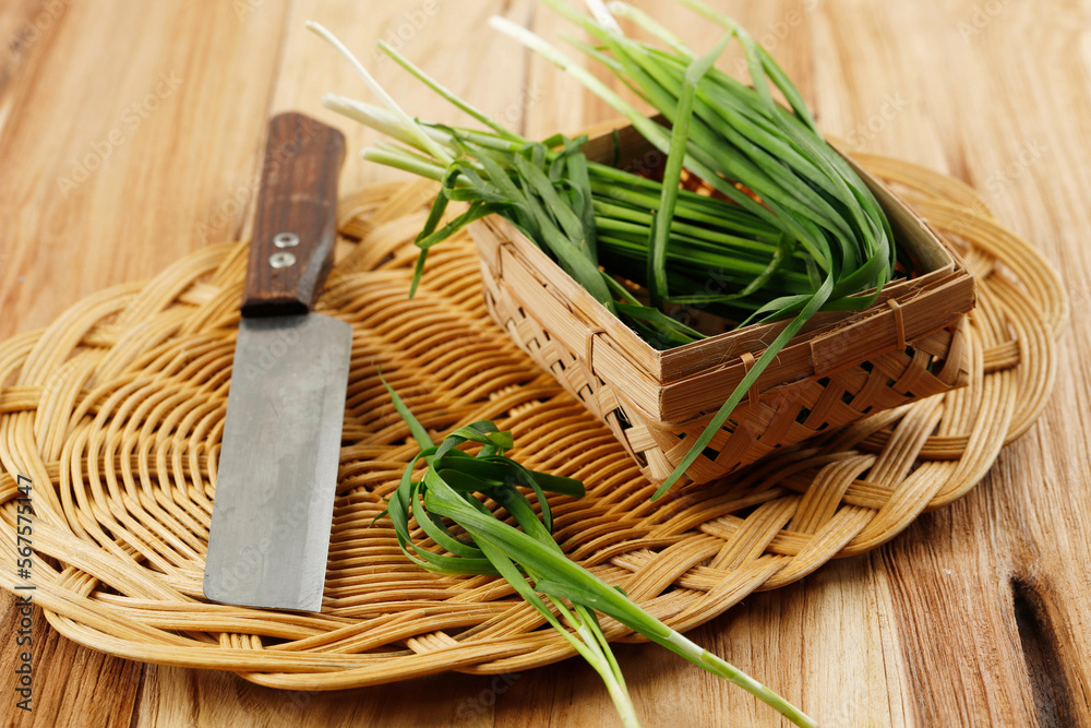 Fresh Chinese Chive or Kui chai Kucai Tie a Rope on Wooden Table.