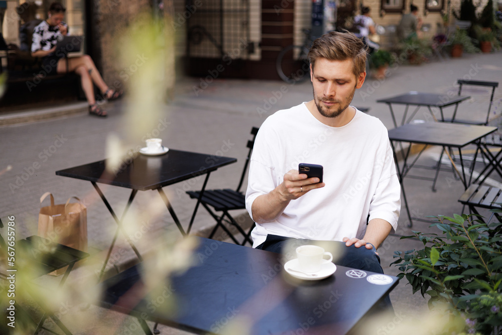 Sustainable city. Male mobile banking and shopping app. Green city street cafe. Man wearing white shirt and using smartphone. Coffee cup on the table. Workation mobile internet on the go