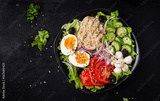 Healthy breakfast. Savory oatmeal with fresh cucumber, tomatoes, olives, lettuce, mozzarella cheese and boiled egg. Top view
