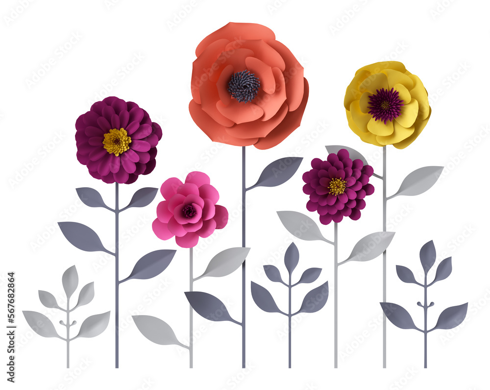 Pink and red paper craft flower bouquet. 3d illustration