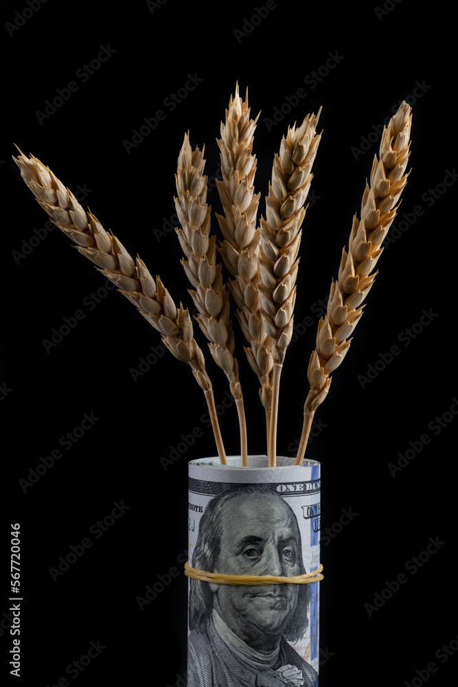 Ripe ears of wheat and rolled up 100 US dollar bills