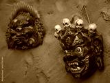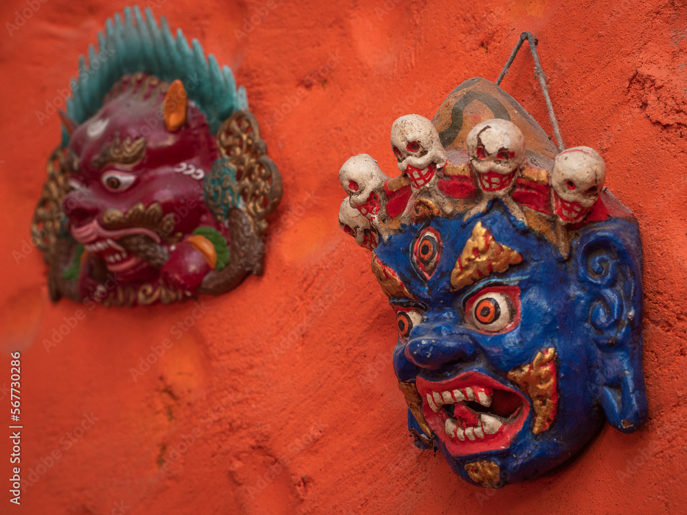 Wooden painted masks representing Mahakala and protector Garuda from buddhist believes.