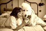 Young woman uses smart phone while lying with her cute adorable dog in bed at cozy bedroom in beige tones. Concept of leisure time with pets