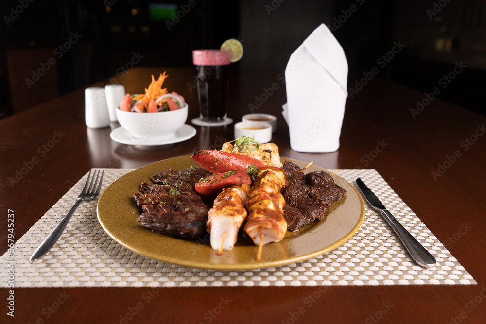 Anticuchos de carne y corazón en la mesa de un restaurante de comida típica en el Perú.