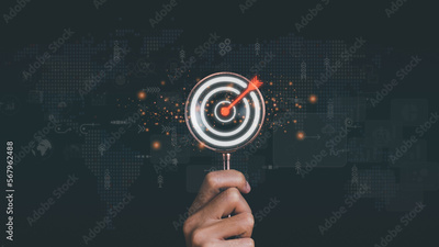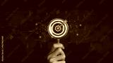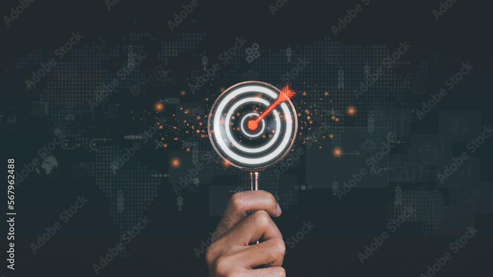 magnifying glass in businessman hand and arrow icon hitting center of dartboard target,Setting business goals and focused concepts, Organizational growth and objectives, marketing strategy planning.