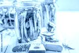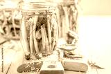 Homemade canned yellow and green beans with vegetables from greenhouse.