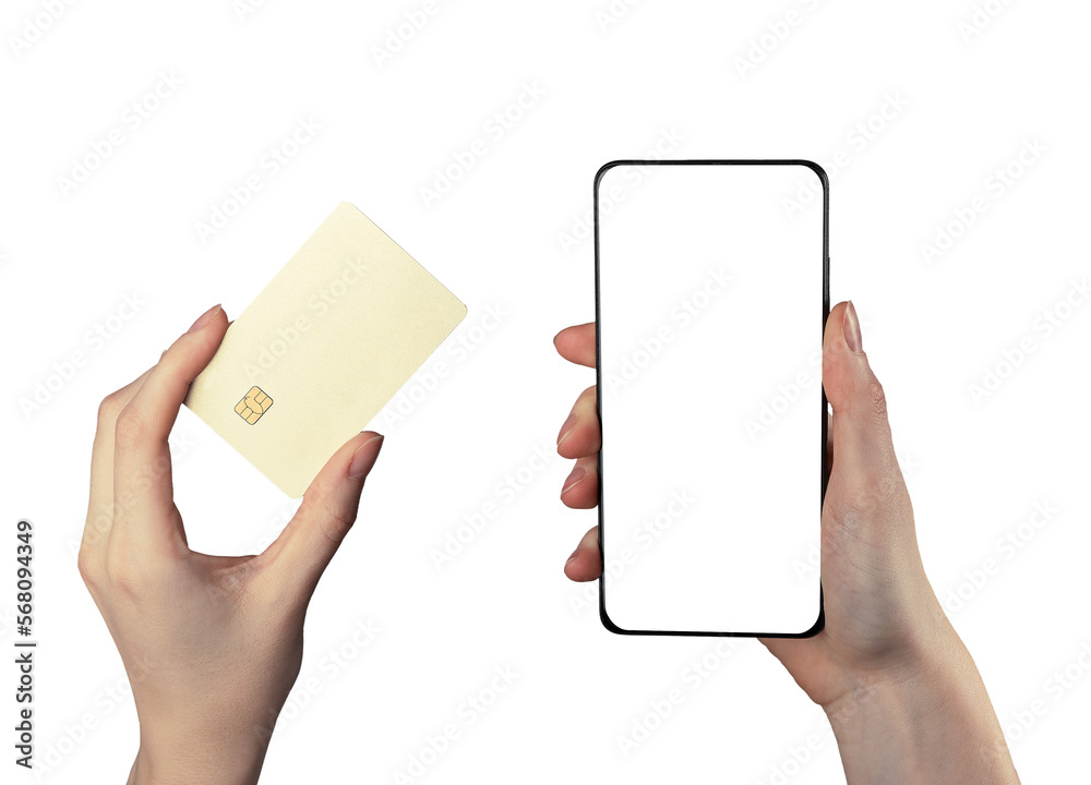 Bank card mockup and phone screen mock-up for mobile finance app promotion. Smartphone display template, frame and electronic money in hand for online payment service