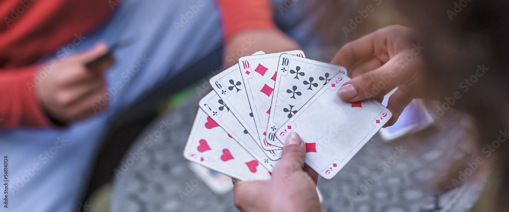 Card playing in a spring garden: Couple are sitting on a table, relaxing and playing cards together. Blurry background.