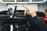 Man removing dent on black car trunk lid. Professional Paintless Dent Repair. Indoor closeup shot. Mechanic and car detailing studio. High quality photo