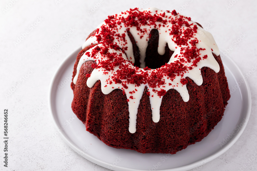 Red velvet bundt cake with cream cheese frosting and cake crumbs