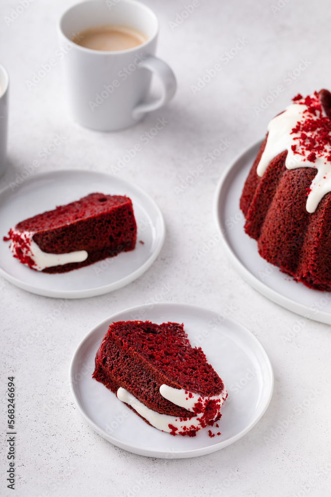 Red velvet bundt cake with cream cheese frosting and cake crumbs