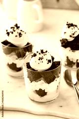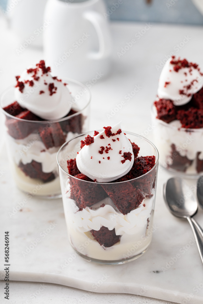 Red velvet trifle or parfait with cream cheese mousse and whipped cream